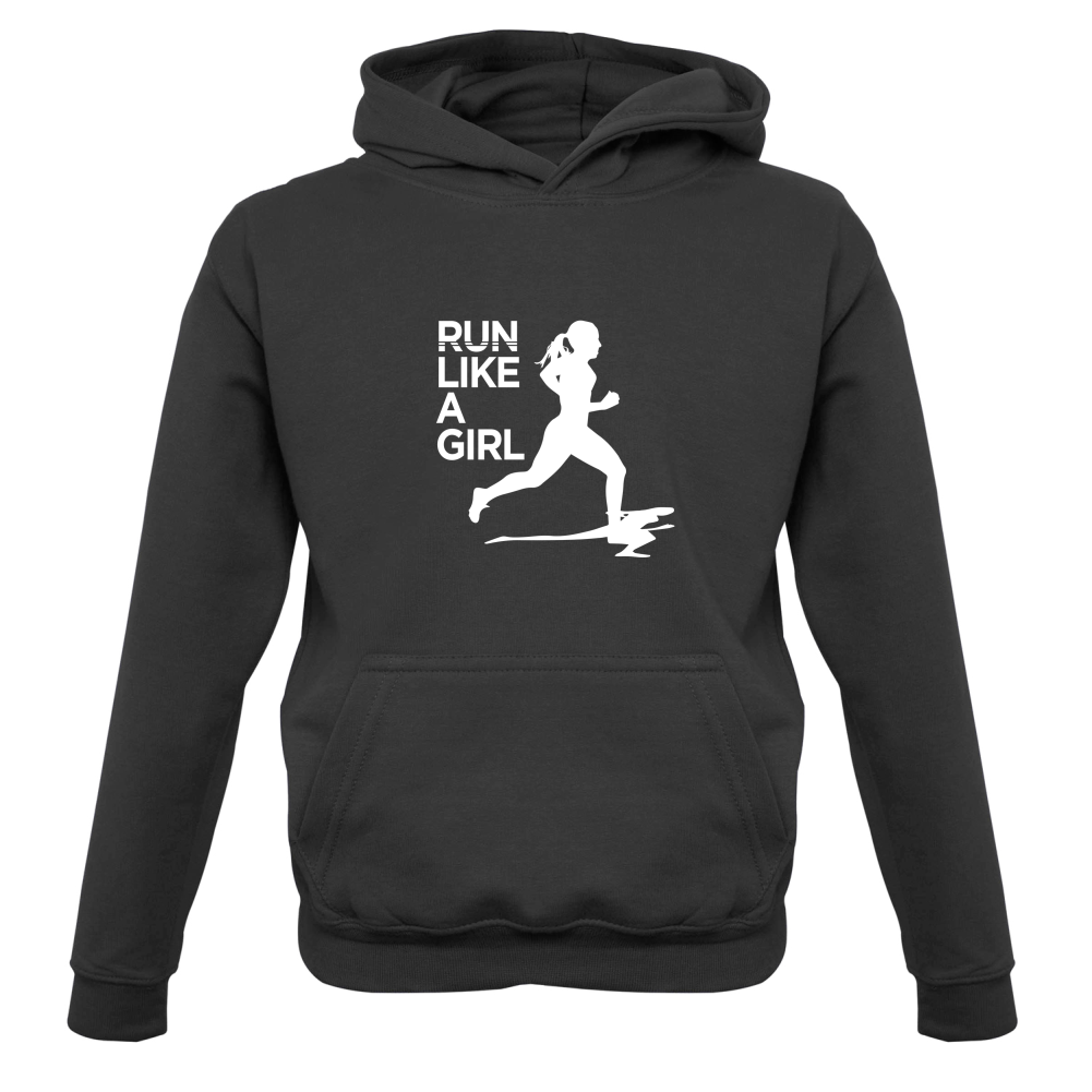 Kids Hoodie: Our kids unisex style Run Like A Girl Hoodie is printed on our 300 GSM kangaroo pocket hooded top and is available on 7 different Colours.