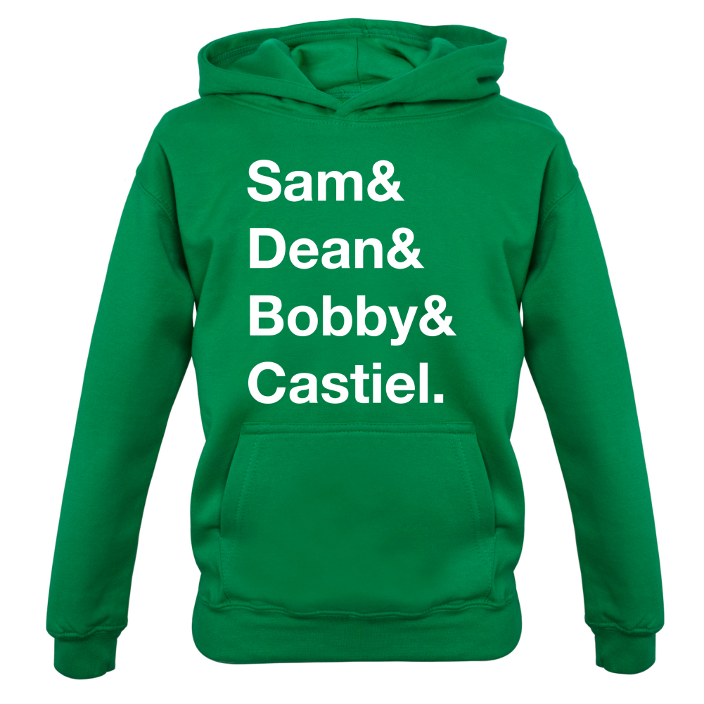 Kids Hoodie: Our kids unisex style Sam & Dean & Bobby & Castiel Hoodie is printed on our 300 GSM kangaroo pocket hooded top and is available on 7 different Colours.