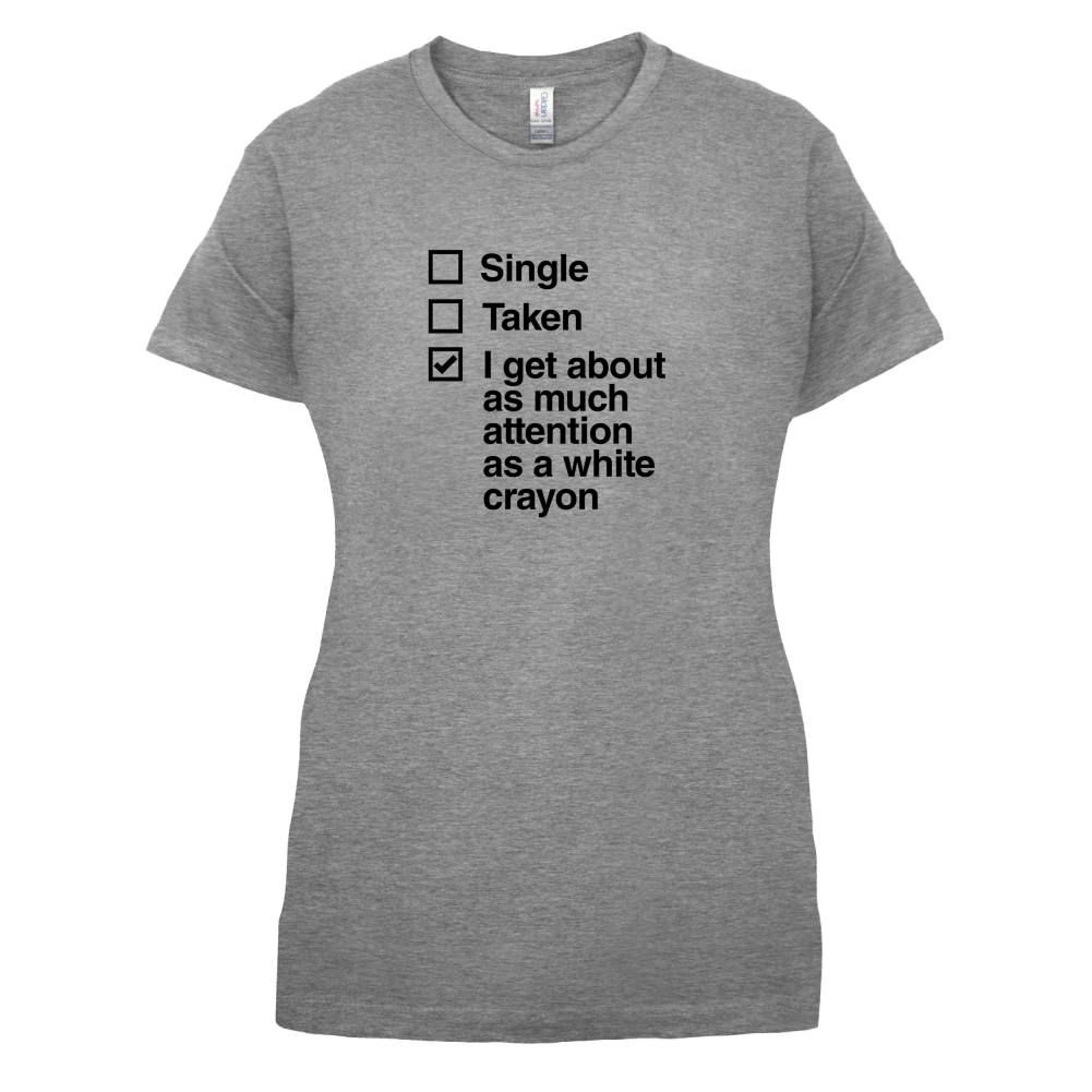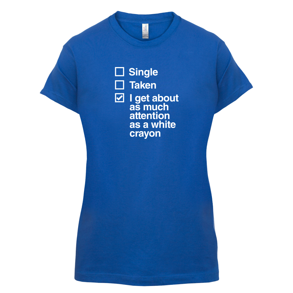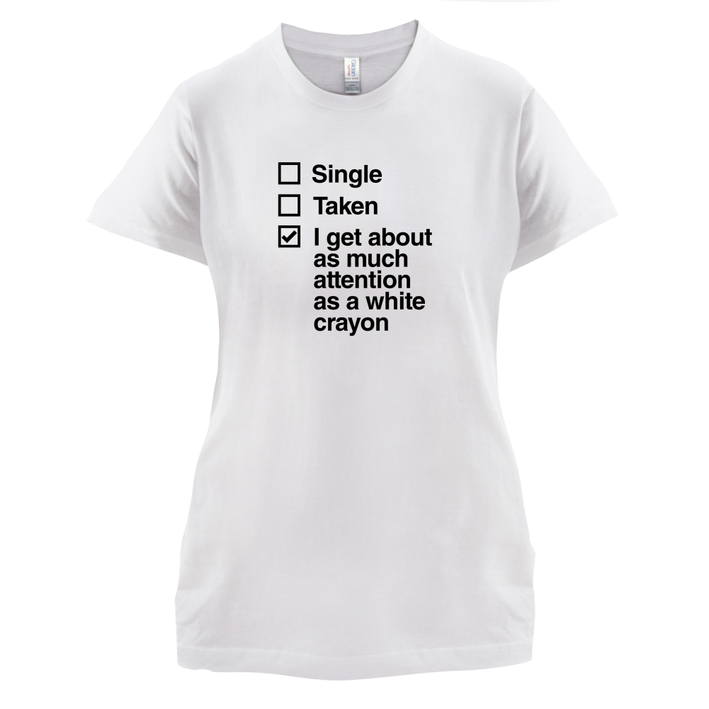 Women's Slim fit T-shirt, our ladies Single Taken White Crayon t-shirt is printed on our popular 150 GSM ring spun womens garment. Available in 11 colours and from Size Small to XXL.