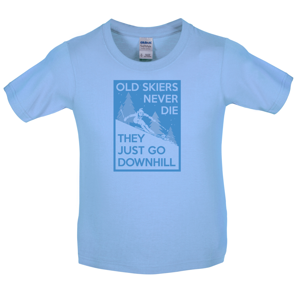Kids T-shirt: Our Kid's Unisex style Skiers Go Downhill T-shirt is printed on our 150 GSM ringspun cotton garment and is available on 8 different colours.