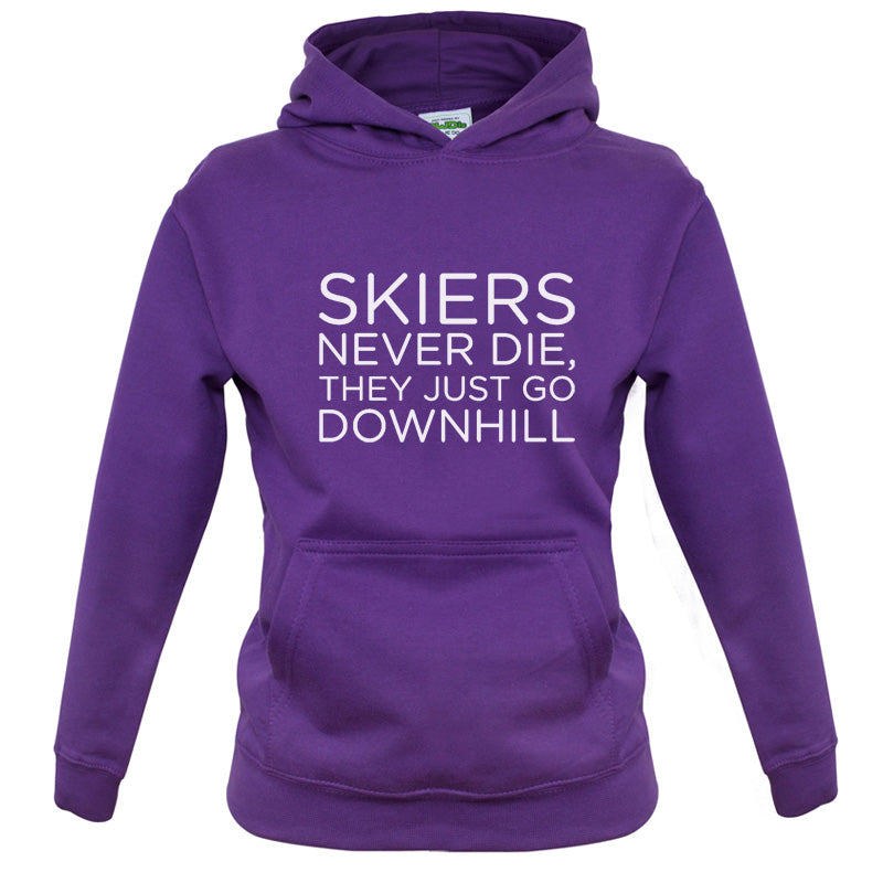 Kids Hoodie: Our kids unisex style Skiers Never Die, They Just Go Downhill Hoodie is printed on our 300 GSM kangaroo pocket hooded top and is available on 7 different Colours.