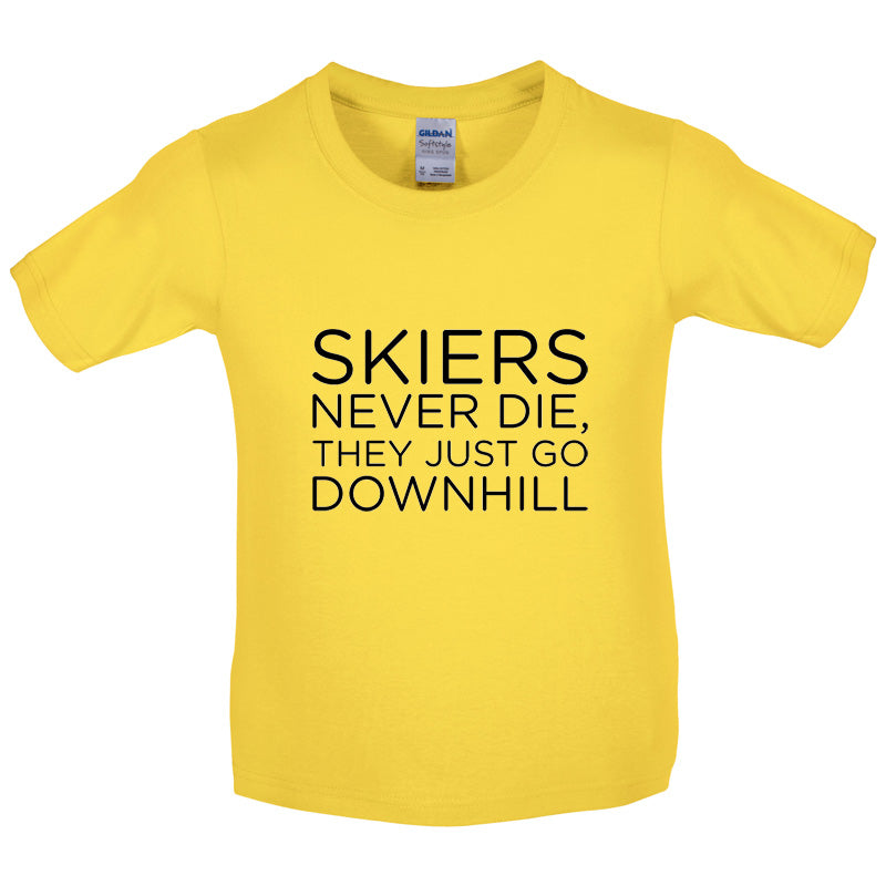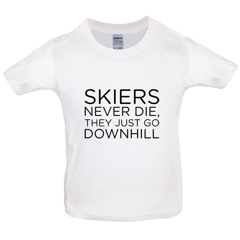 Kids T-shirt: Our Kid's Unisex style Skiers Never Die, They Just Go Downhill T-shirt is printed on our 150 GSM ringspun cotton garment and is available on 8 different colours.