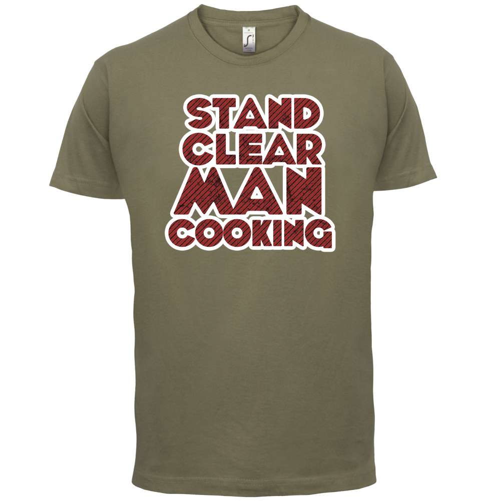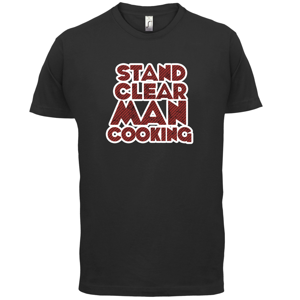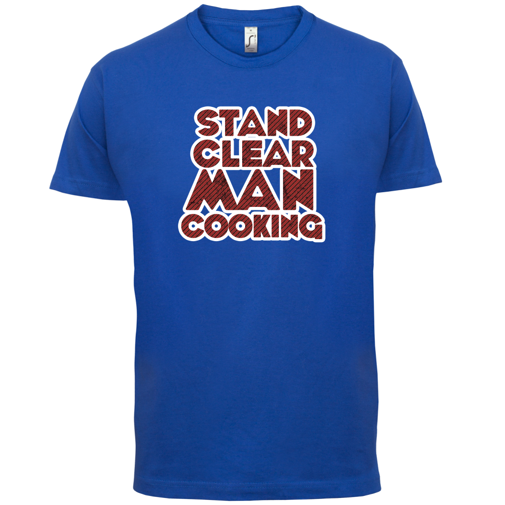 Mens Unisex T-Shirt, our men's Stand Clear Man Cooking t shirt is printed onto our premium 190 GSM one piece crew neck t-shirt. Available in 10 Colours and from Size Small to XXL.