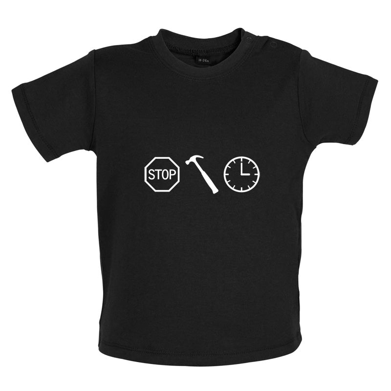 Baby/Toddler T-shirt: Our Baby Unisex style Stop Hammer Time T-shirt is printed on our high quality 200 gsm ringspun cotton garment which features shoulder poppers to ease getting your little one dressed. Our Baby T-shirts are available in a choice of Eight colours.