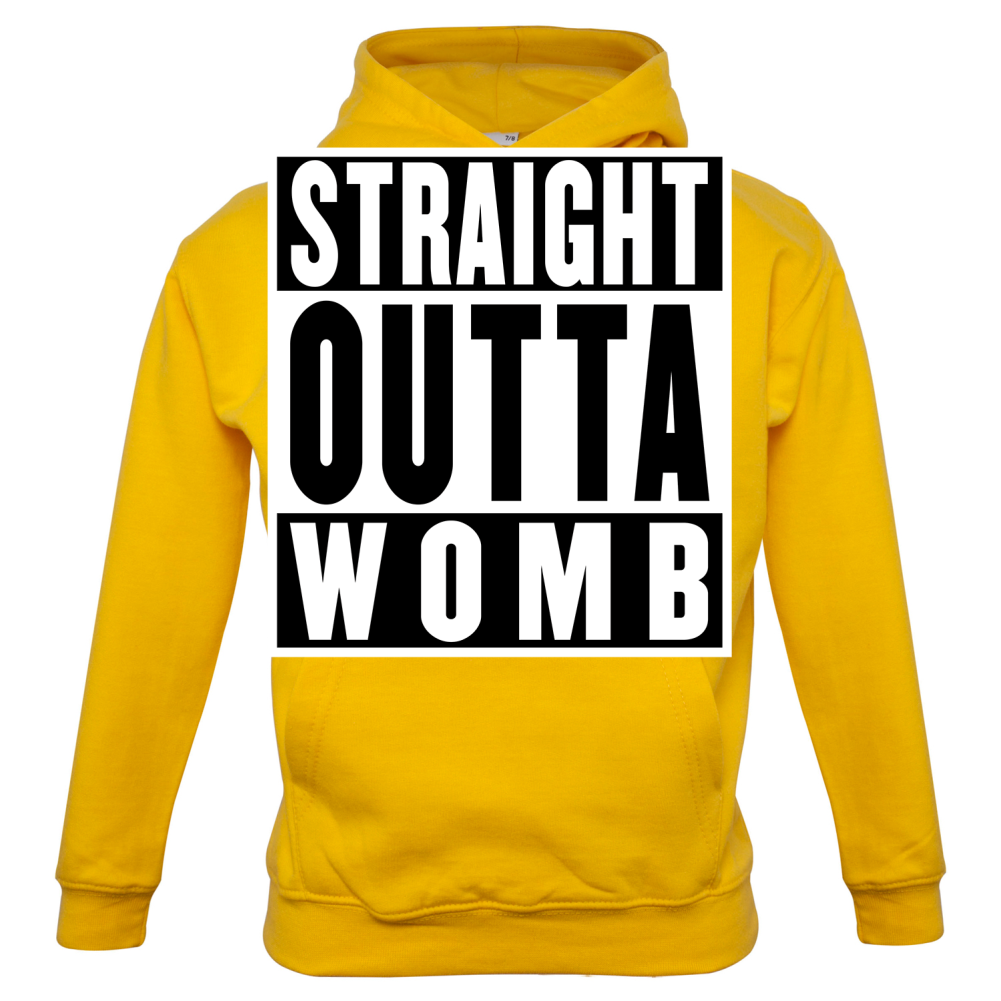 Kids Hoodie: Our kids unisex style Straight Outta Womb Hoodie is printed on our 300 GSM kangaroo pocket hooded top and is available on 7 different Colours.