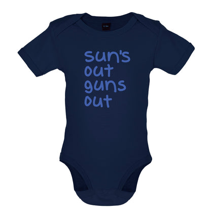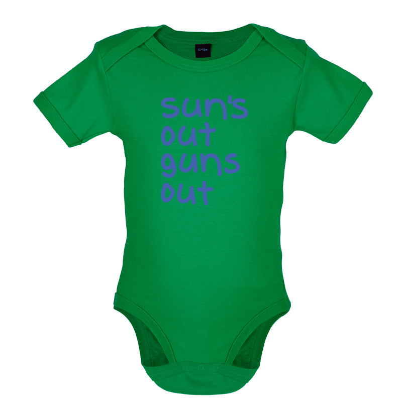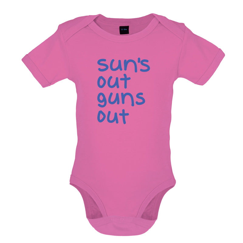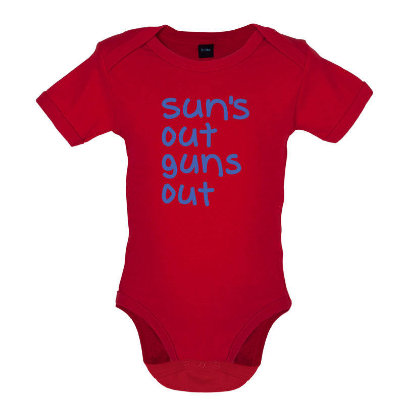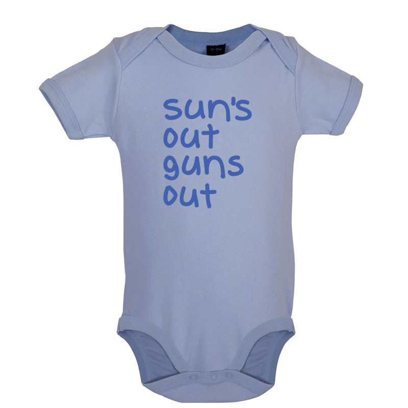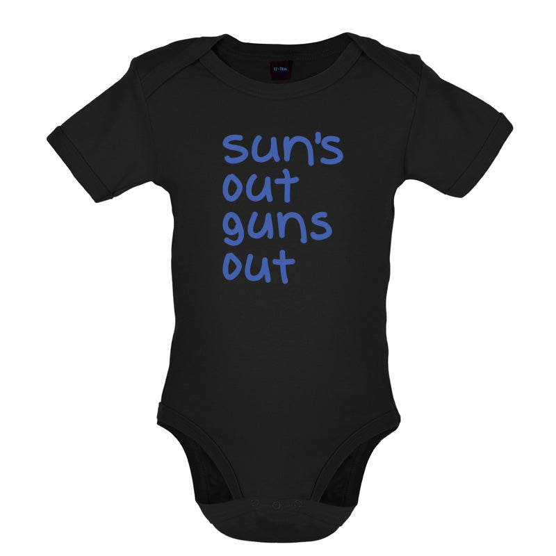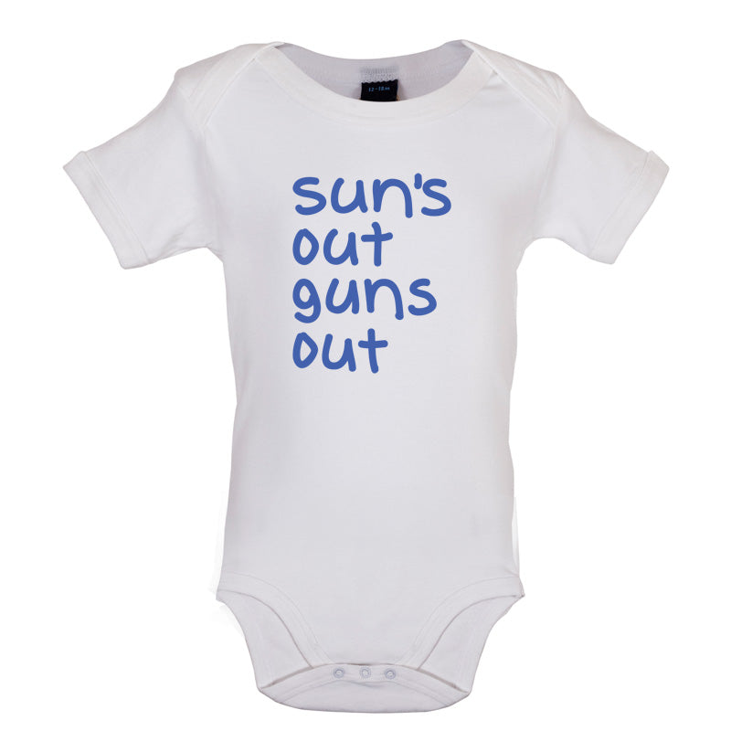 Babygrow/Bodysuit: Our Baby unisex style Suns Out Guns Out Babygrow is printed on our 200 GSM short sleeve bodysuit and is available in a choice of 6 different Colours.