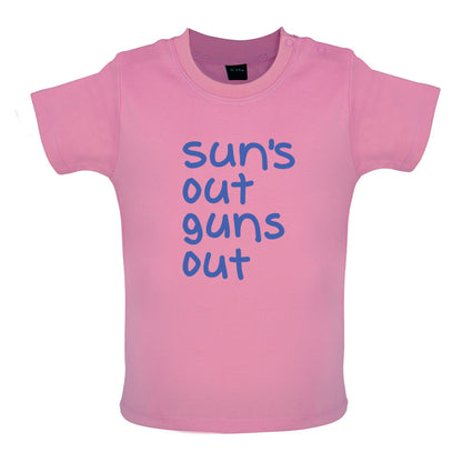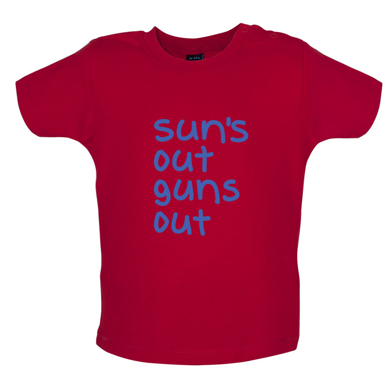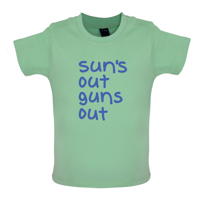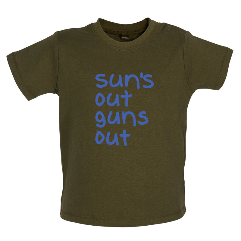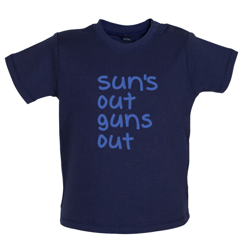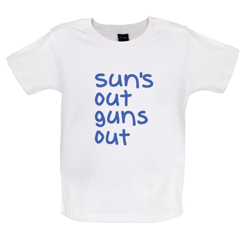 Baby/Toddler T-shirt: Our Baby Unisex style Suns Out Guns Out T-shirt is printed on our high quality 200 gsm ringspun cotton garment which features shoulder poppers to ease getting your little one dressed. Our Baby T-shirts are available in a choice of Eight colours.
