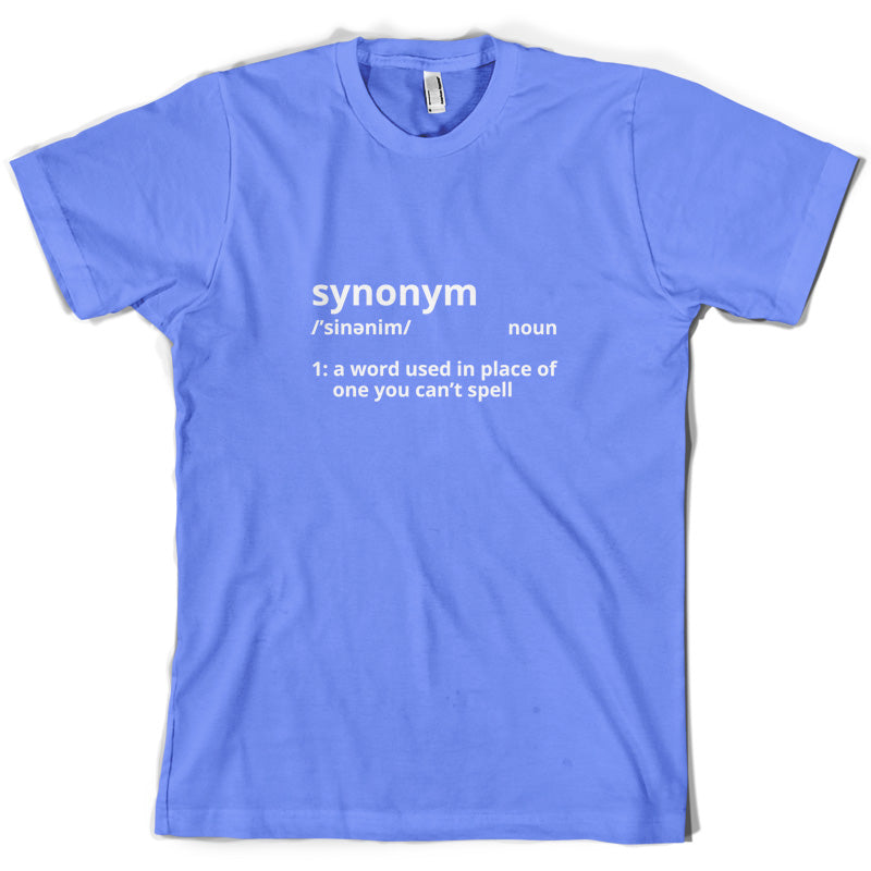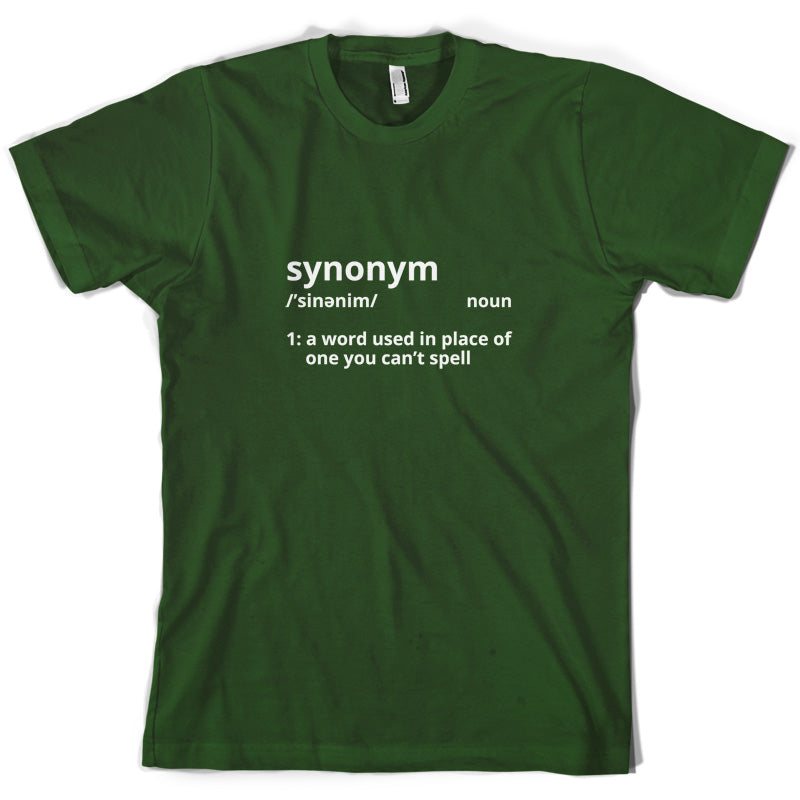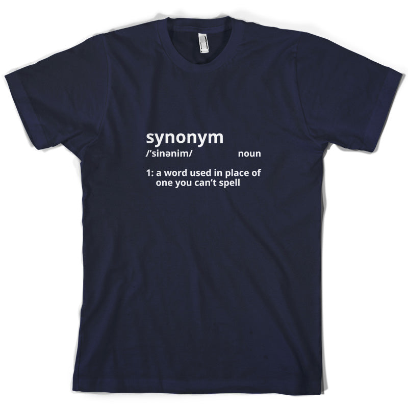 Mens Unisex T-Shirt, our men's Synonym A Word In Place Of One You Can't Spell t shirt is printed onto our premium 190 GSM one piece crew neck t-shirt. Available in 10 Colours and from Size Small to XXL.