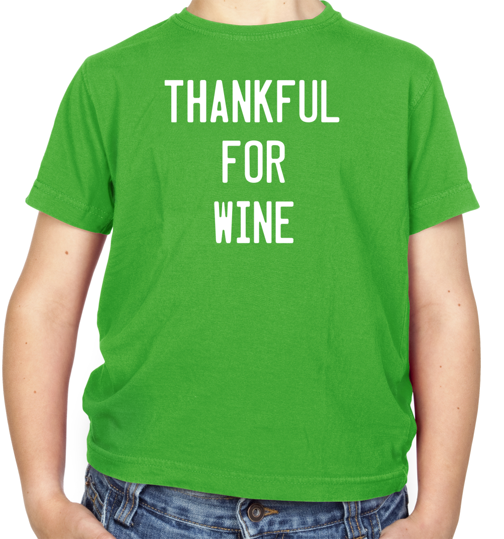 Kids T-shirt: Our Kid's Unisex style Thankful For Wine T-shirt is printed on our 150 GSM ringspun cotton garment and is available on 8 different colours.