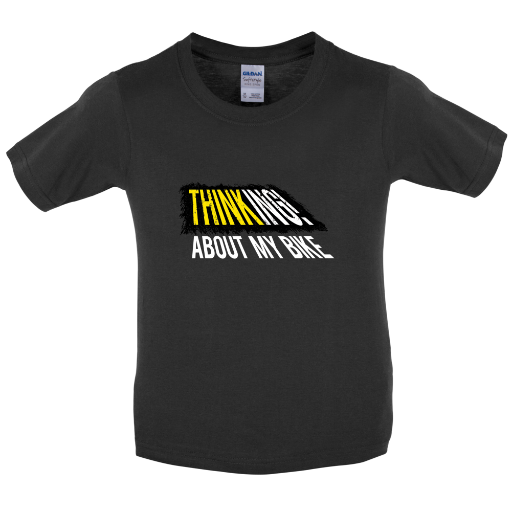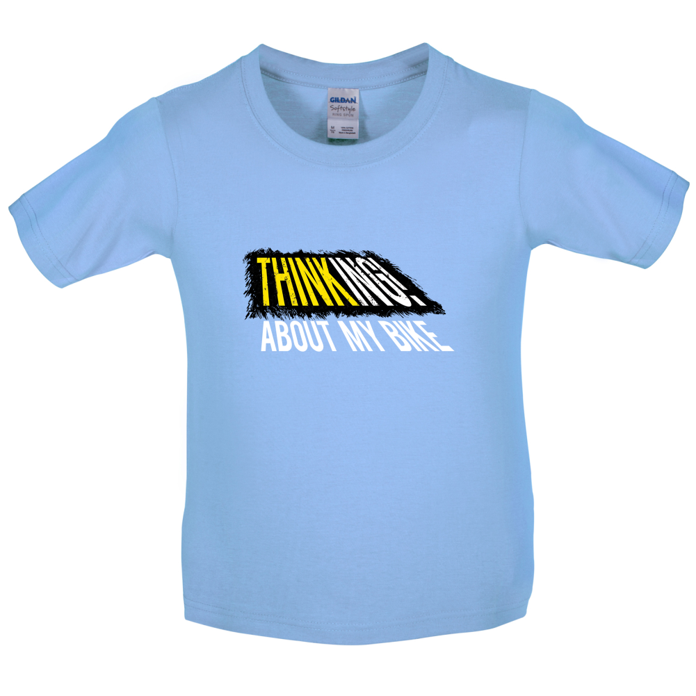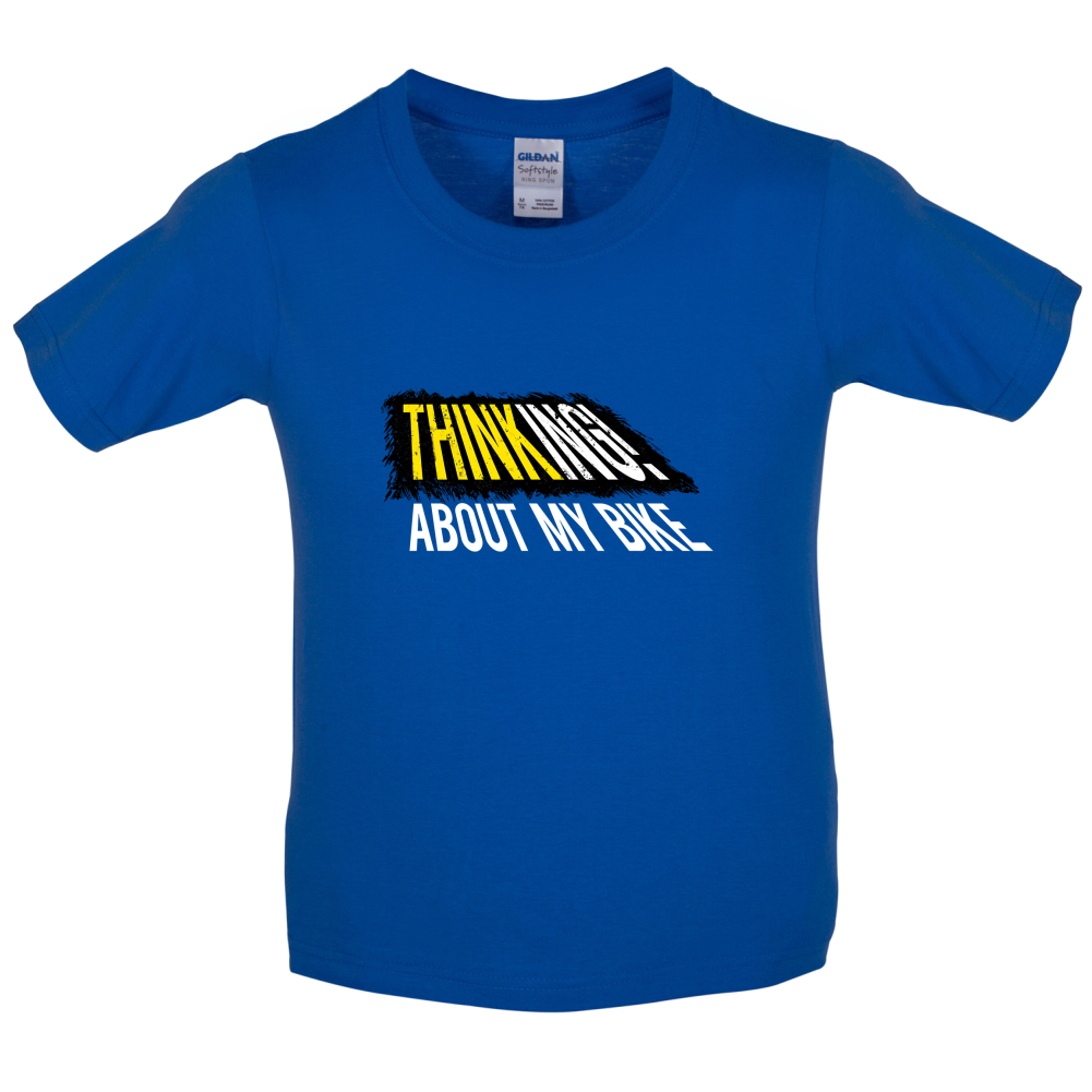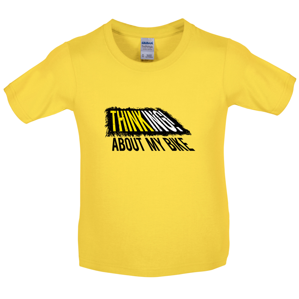 Kids T-shirt: Our Kid's Unisex style Thinking About My Bike T-shirt is printed on our 150 GSM ringspun cotton garment and is available on 8 different colours.