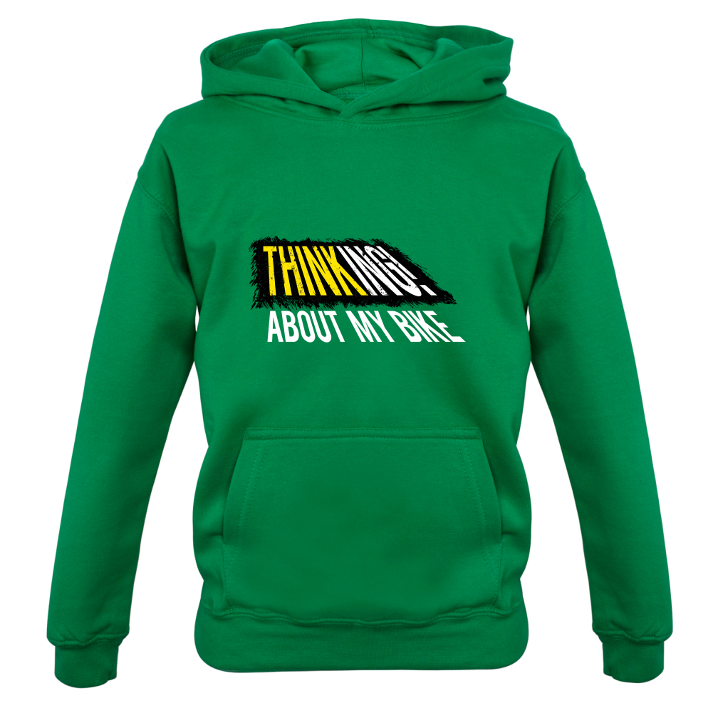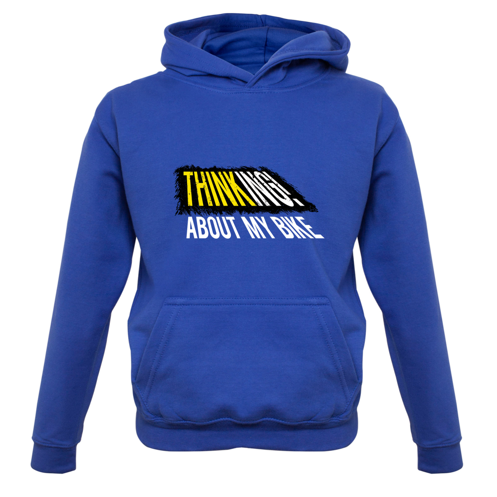 Kids Hoodie: Our kids unisex style Thinking About My Bike Hoodie is printed on our 300 GSM kangaroo pocket hooded top and is available on 7 different Colours.