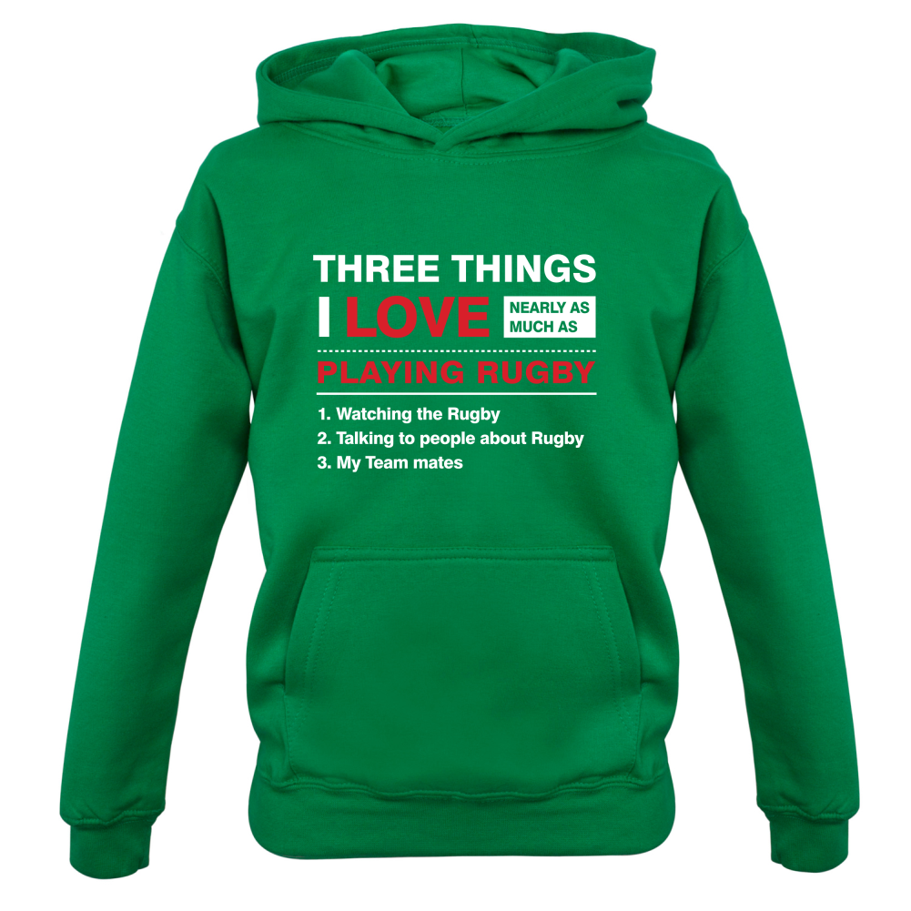 Kids Hoodie: Our kids unisex style Three Things I Love Nearly As Much As Rugby Hoodie is printed on our 300 GSM kangaroo pocket hooded top and is available on 7 different Colours.