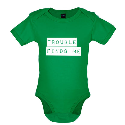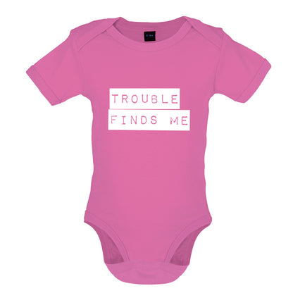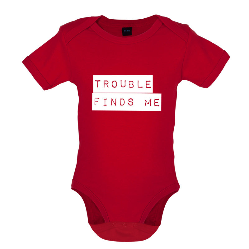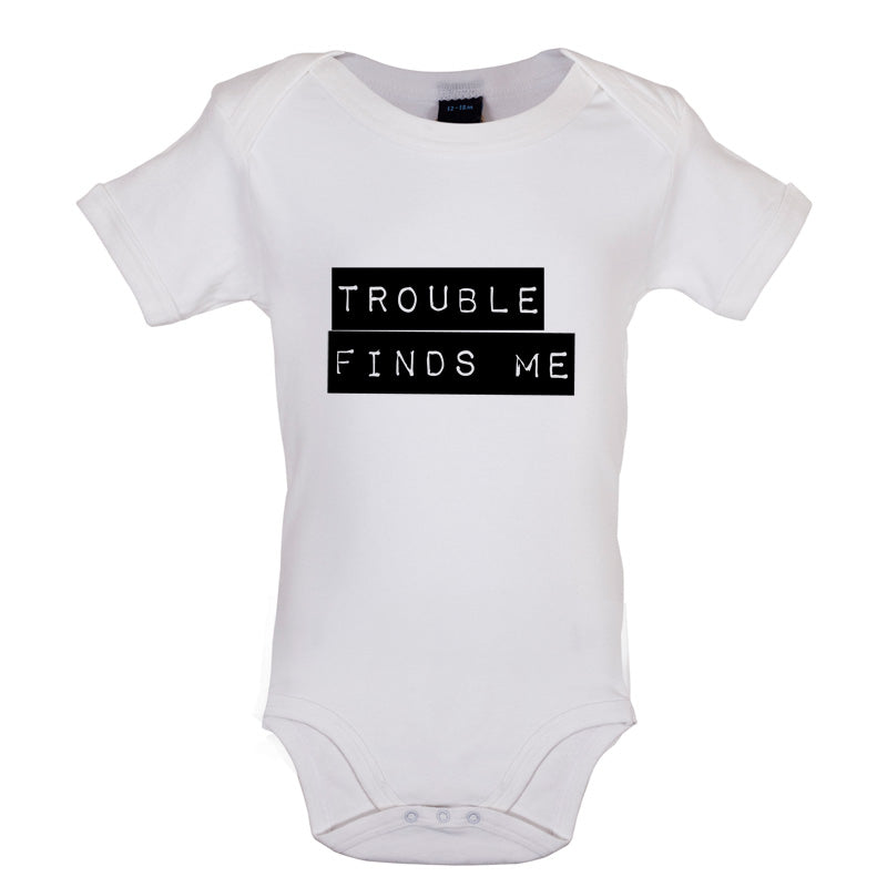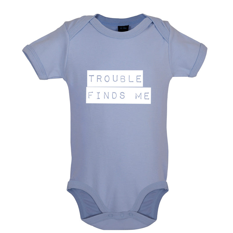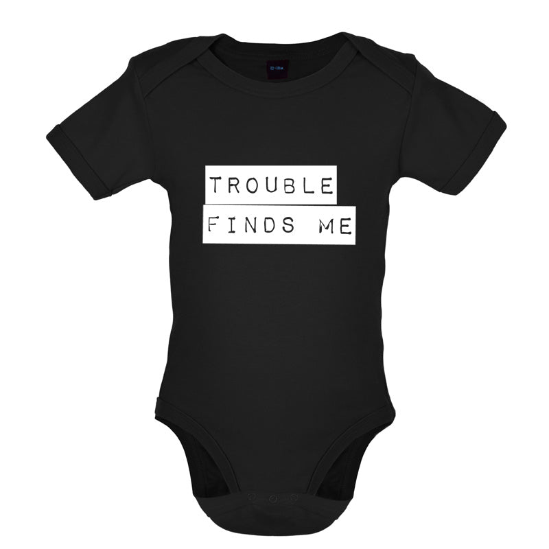 Babygrow/Bodysuit: Our Baby unisex style Trouble Finds Me Babygrow is printed on our 200 GSM short sleeve bodysuit and is available in a choice of 6 different Colours.