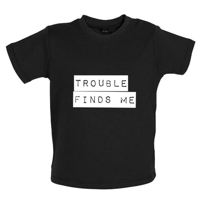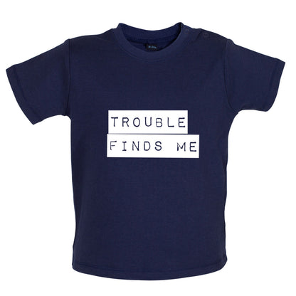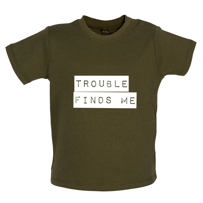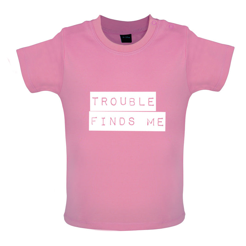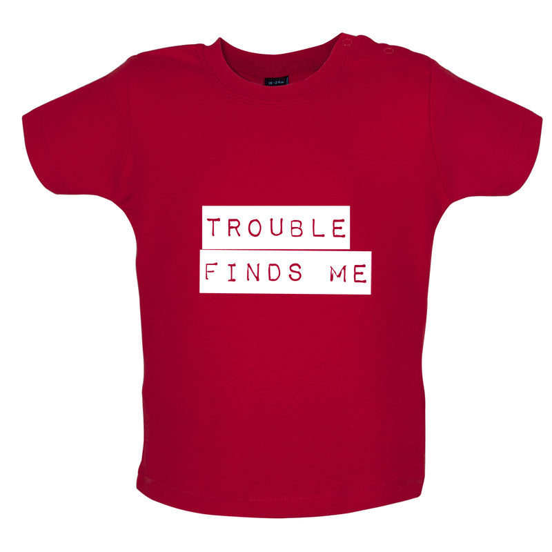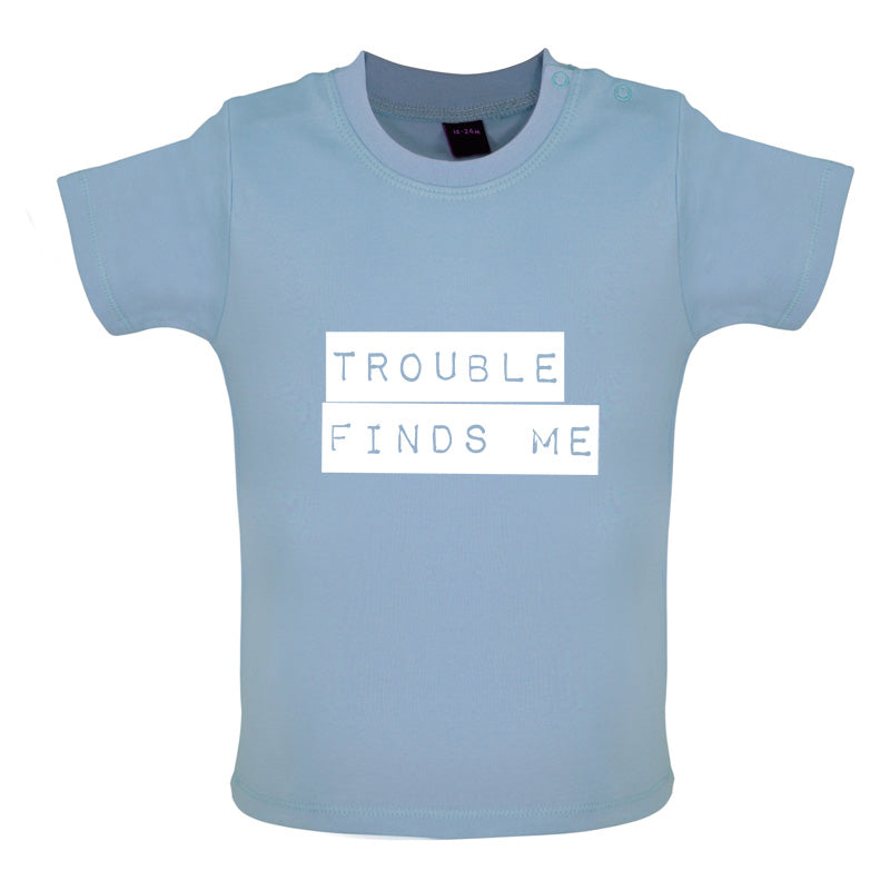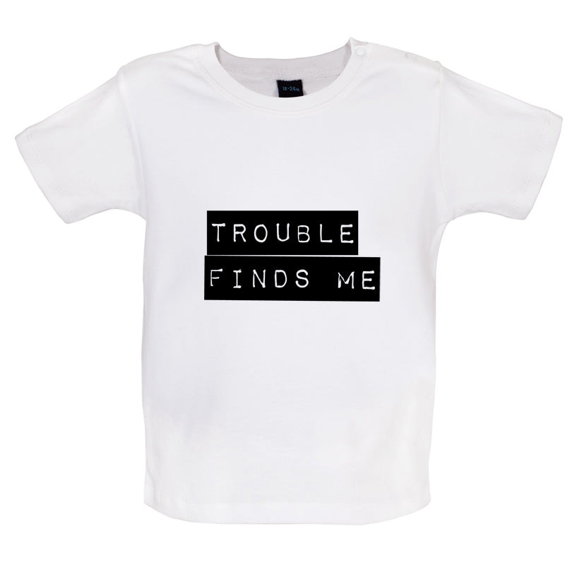 Baby/Toddler T-shirt: Our Baby Unisex style Trouble Finds Me T-shirt is printed on our high quality 200 gsm ringspun cotton garment which features shoulder poppers to ease getting your little one dressed. Our Baby T-shirts are available in a choice of Eight colours.