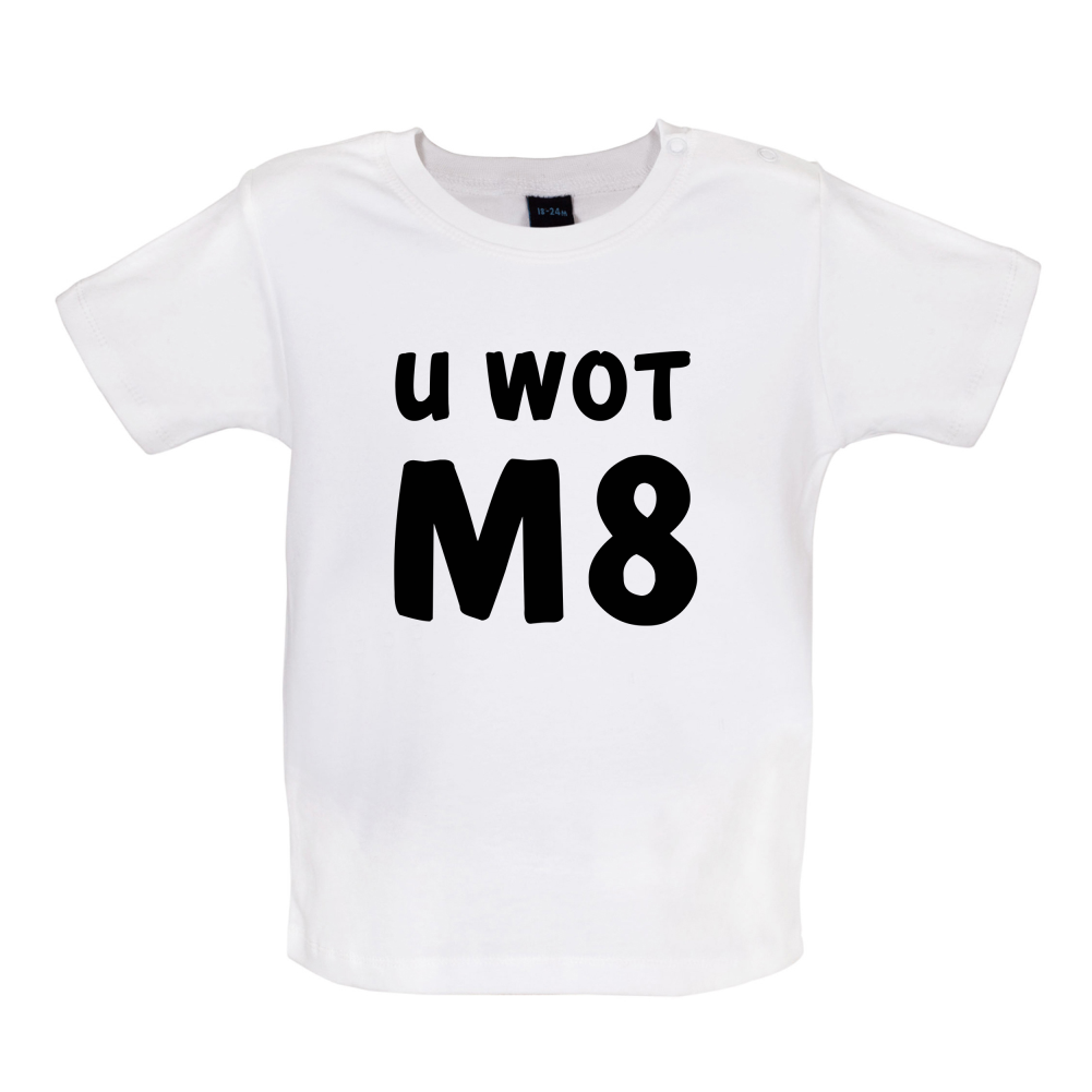 Baby/Toddler T-shirt: Our Baby Unisex style U WOT M8 T-shirt is printed on our high quality 200 gsm ringspun cotton garment which features shoulder poppers to ease getting your little one dressed. Our Baby T-shirts are available in a choice of Eight colours.