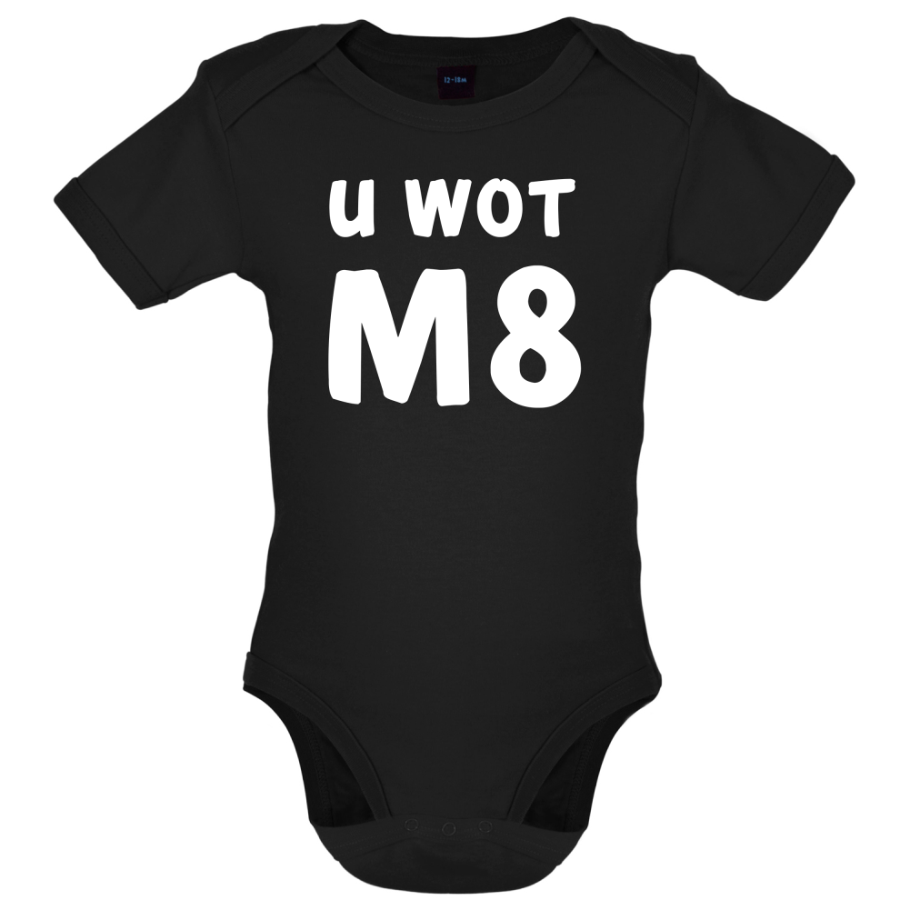 Babygrow/Bodysuit: Our Baby unisex style U WOT M8 Babygrow is printed on our 200 GSM short sleeve bodysuit and is available in a choice of 6 different Colours.