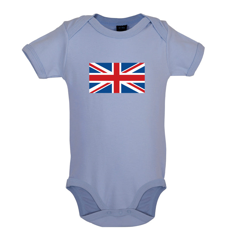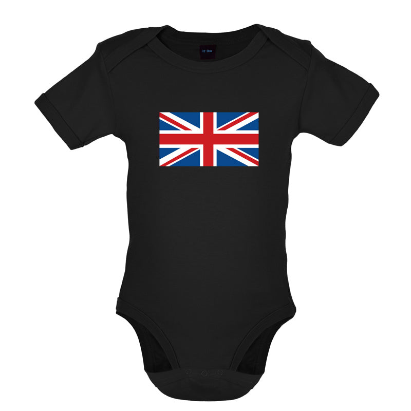Babygrow/Bodysuit: Our Baby unisex style Union Jack Flag Babygrow is printed on our 200 GSM short sleeve bodysuit and is available in a choice of 6 different Colours.