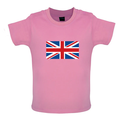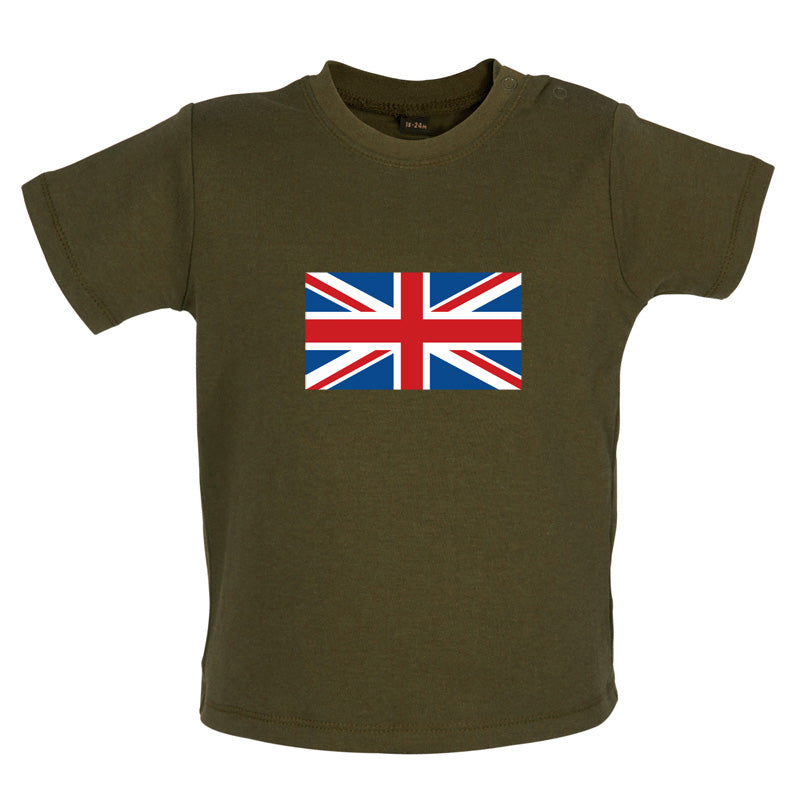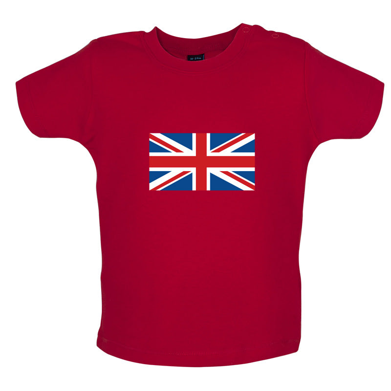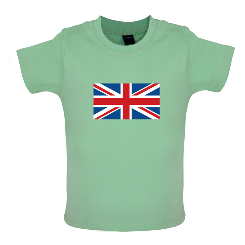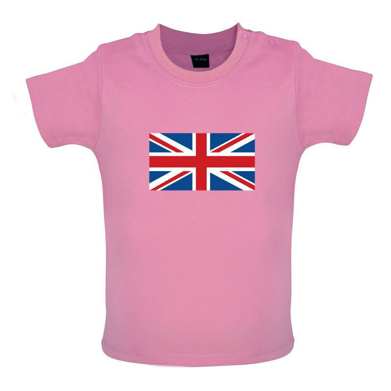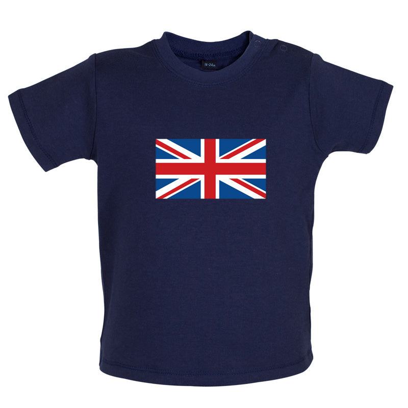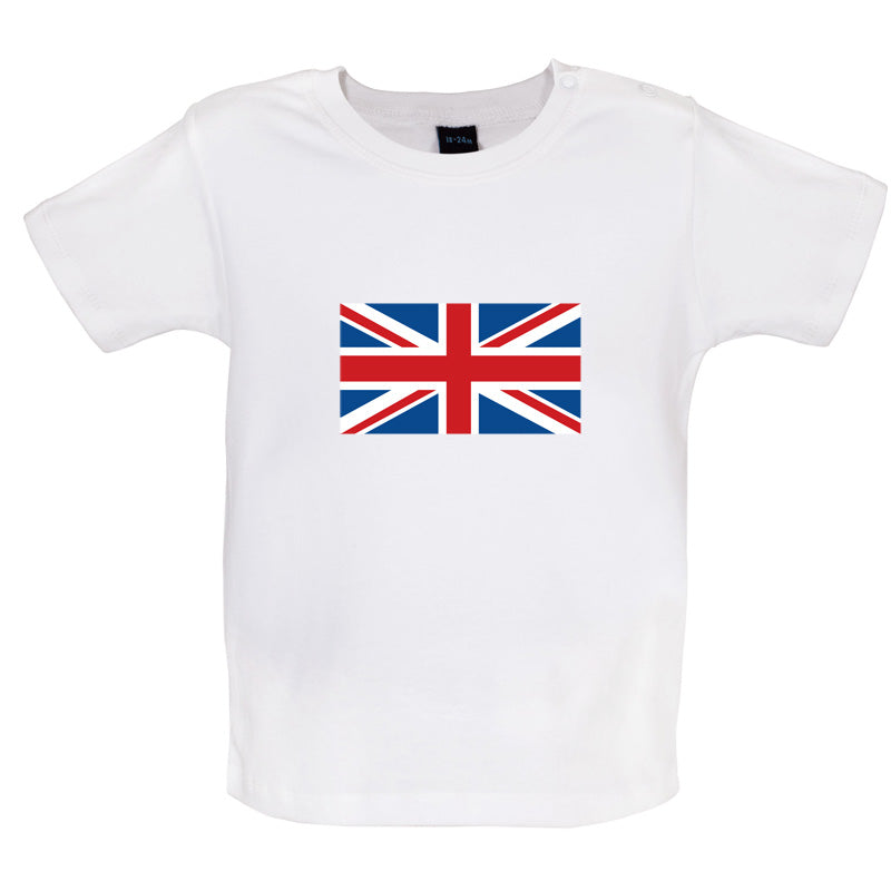 Baby/Toddler T-shirt: Our Baby Unisex style Union Jack Flag T-shirt is printed on our high quality 200 gsm ringspun cotton garment which features shoulder poppers to ease getting your little one dressed. Our Baby T-shirts are available in a choice of Eight colours.