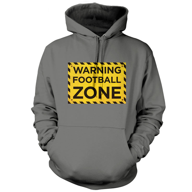 Unisex Hoodie, Our unisex style Warning Football Zone Hooded top is printed on our 280 GSM kangaroo pocket garment and is Available in 9 Colours and with sizes Small to XXL.