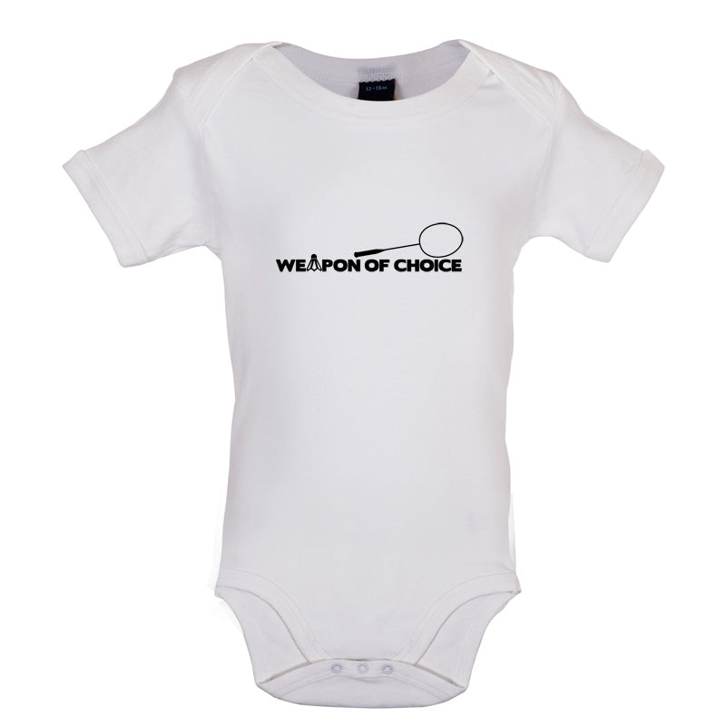 Babygrow/Bodysuit: Our Baby unisex style Weapon Of Choice Badminton Babygrow is printed on our 200 GSM short sleeve bodysuit and is available in a choice of 6 different Colours.