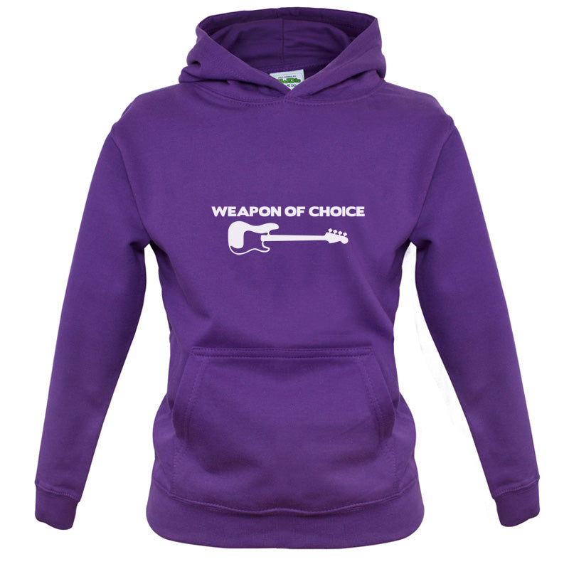 Kids Hoodie: Our kids unisex style Weapon Of Choice Bass Guitar Hoodie is printed on our 300 GSM kangaroo pocket hooded top and is available on 7 different Colours.